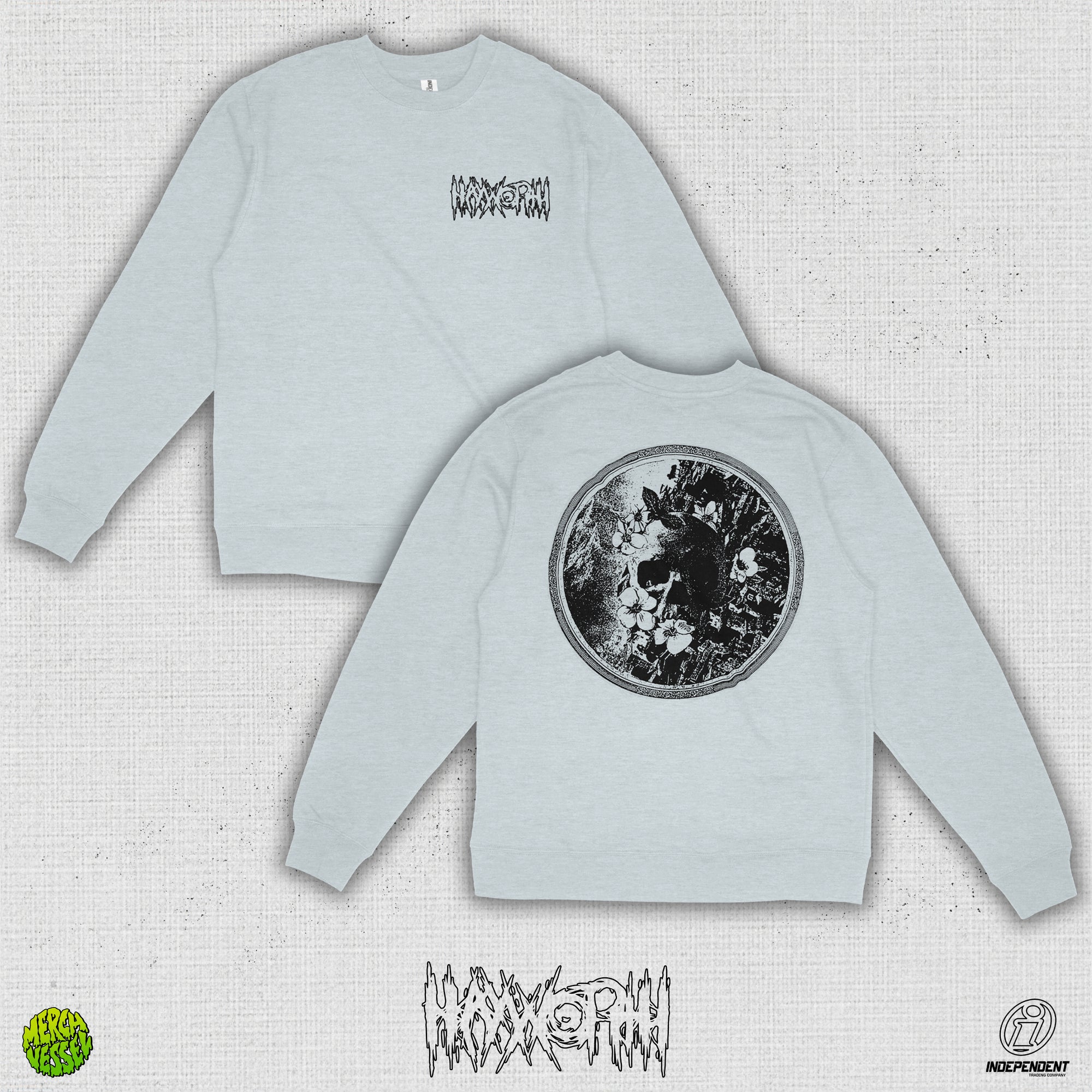 These are printed on heather gray Independent midweight crewneck sweaters. This is a midweight 8.5oz sweater.